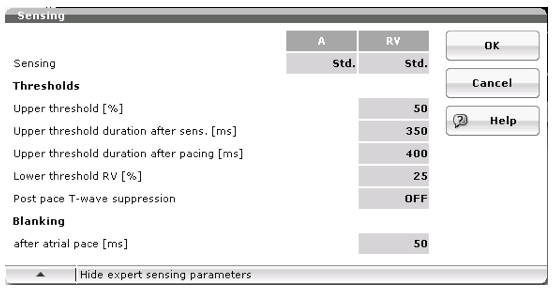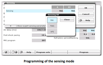 This option was introduced with the Lumax 540 model. A 2-mV sensitivity is maintained for a 300-ms period after ventricular pacing, while in the Lumax 740 model, the sensitivity is set by default at 3 mV and maintained for a 400-ms period after ventricular pacing. These settings can be changed by unlocking a code.