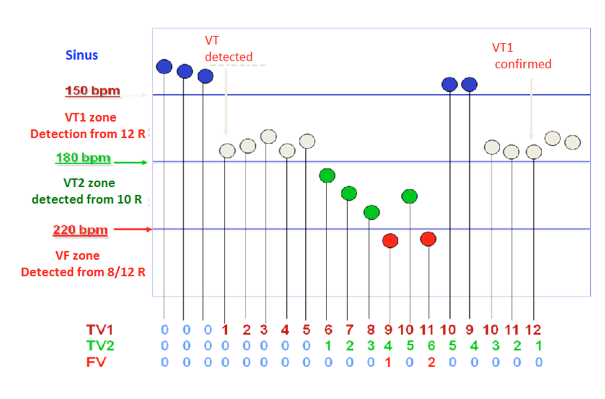 The various ventricular events are classified as a function of the RR cycles during ventricular pacing, sinus rhythm, VT1, VT2 or VF. The lower limit of each zone is programmable, and the several zones are continuous. Each cycle in a tachycardia or VF zone increases the count by 1 in that zone, and the detection of a cycle in a fast zone increments by 1 the counter in a slower tachycardia zone. A cycle in the sinus zone decrements all prior counters by 1. When the counter has reached the number of required cycles (26 in the VT1 and 16 in the VT2 zone by default, 8 out 12 cycles in a sliding window in the VF zone), the diagnosis is made and the associated therapy is delivered.