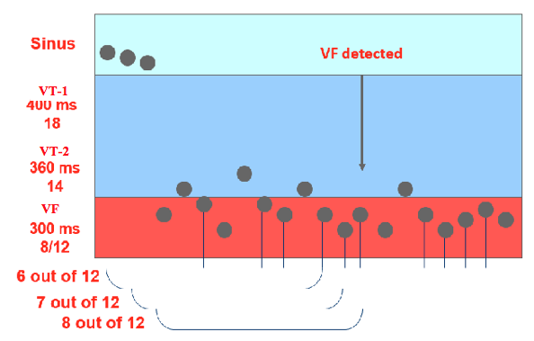 An episode of VF is detected when X out of Y (here 8 out of 12) intervals are shorter than the limit of the VF zone; 9 choices are programmable, from a shortest of 6 out of 8, to the longest of 24 out of 30 intervals