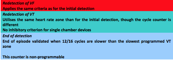 The phase of redetection begins when a therapy has been delivered. The programmed counts in the VT1 and VT2 zones must be lower than those applied in the initial detection in order to not delay the delivery of a new therapy when the first was unsuccessful (20 cycles for the VT1 and 14 cycles for the VT2 zone by default). The same X/Y cycles ratio is applied in the VF zone for the initial detection and the redetection.