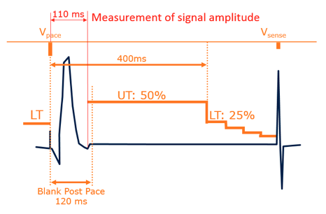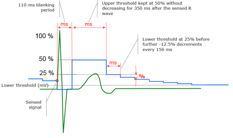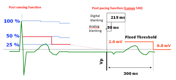 In defibrillators older than the Lumax 740, a 50-ms analog blanking period begins after ventricular pacing during which no signal is sensed or visualised and a 215-ms digital blanking period during which the signal is not sensed though is visualised. Sensing begins at 2 mV for 85 ms after the end of blanking, then decreases to the programmed value of 0.8 mV. Starting with the Lumax 740 generation, a 19.5 ms analog blanking period begins after ventricular pacing and a digital blanking period of 120 ms. The upper threshold, which corresponds to a value equal to 50% of the post-pacing evoked response, is maintained for 400 ms. Then the sensitivity increases as the threshold falls to 25% (25% lower threshold) for 156 ms. The sensitivity then increases gradually throughout the cardiac cycle, with an additional -12.5% decrement every 156 ms, until the programmed sensitivity is reached.