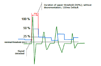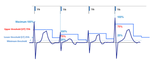 The analysis of a ventricular EGM includes a positive and a negative component. Biotronik defibrillators measure the amplitude of the highest positive or negative peak. The onset of an R wave is followed by a 110-ms blanking period, after which ventricular sensing begins for amplitudes >50% of the sensed R wave (upper threshold at 50%). This threshold persists for 350 ms (360 ms for defibrillators older than the 740 model) after sensing of the R wave (240 ms after the end of the blanking period). Thereafter, the sensitivity increases to a 25% threshold (25% lower threshold) for a 156-ms duration. In the Lumax 740 defibrillators, the sensitivity increases regularly throughout the cardiac cycle in further decremental steps of -12.5% every 156 ms until it reaches either the nominal sensitivity of 0.8 mV, or a value programmable between 0.5 and 2.5 mV. In older models, the steps were 0.125 mV every 156 ms.