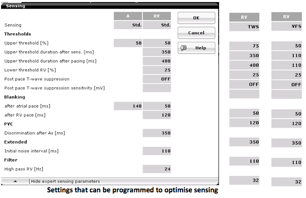 Some settings can be programmed independently and individually to optimise the quality of ventricular sensing. However, the access to these settings is protected by a code known only by the employees of Biotronik Inc.