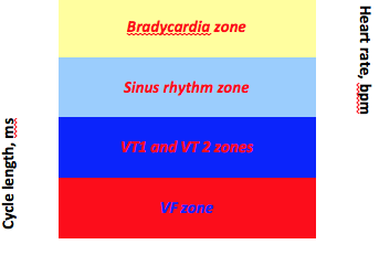 The setting of the defibrillator’s zones of heart rates that prompt the various therapeutic responses is a key programming step. State-of-the-art defibrillators enable the programming of several zones of arrhythmias detected on the basis of the sensed RR intervals. Each zone can be specifically programmed with respect to discrimination and therapies delivered. The number of zones and the range of heart rates that are programmed must be adapted to the characteristics, history and implant indications of each patient.