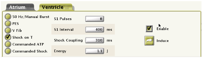 1. Shock‑on‑T : A ventricular arrhythmia (most often VF) is unduced by the delivery of a low energy shock during the ventricular vulnerable period. In practice, a ventricular stimulation sequence (nominally 8 stimuli), at a fixed rate (nominally 150 bpm or a cycle length of 400 ms) is followed by the delivery across the electrodes, of a low-energy electrical shock (nominally 1.1 J) during the ventricular vulnerable period (at a nominal coupling interval of 310 ms).