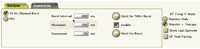 2. HF burst : a manual salvo of rapid pulses at a 20-ms (50 Hz) cycle length is delivered for as long as the operator presses on the switch and telemetry communication is maintained, up to 30 seconds.