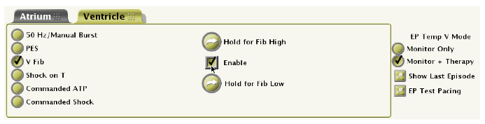 3. VFib induction : pacing the right ventricle across the high voltage electrodes at a very high rate and high amplitude, though the pulse strength is programmable from a weak waveform of 9 V/1.1 ms at 50 ms cycle length (20 Hz) to a strong waveform of 15 V/1.1 ms at 50 ms cycle length. The pulse train is delivered as long as the operator presses on the switch and the telemetry communication is maintained (up to 15 sec). This type of induction often causes a strong and painful stimulation of the adjacent muscle mass, requiring sedation or general anaesthesia.