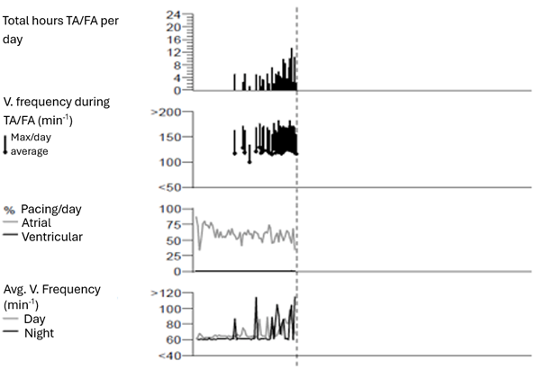 Le rapport du moniteur cardiaque fournit des informations sur les épisodes d'AT/AF et les rythmes ventriculaires, indique le temps passé en AT/AF et fournit des informations sur l'évolution du nombre total d'heures d'AT/AF par jour (graphique).