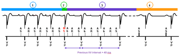Cet algorithme recherche la présence d'un signal auriculaire qui n'est pas vu parce qu'il se situe dans la période de suppression auriculaire après la stimulation ventriculaire :