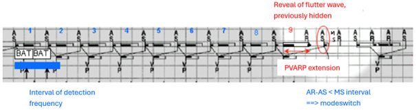 Dans ce cas, au 9ème cycle, l'algorithme augmente le PVARP pour amener l'événement auriculaire suivant (AR) dans la période réfractaire, ne pas stimuler le ventricule sur un battement, et démasquer l'onde de flutter suivante (AS), qui n'est plus cachée dans le blanking auriculaire post-stimulation ventriculaire.