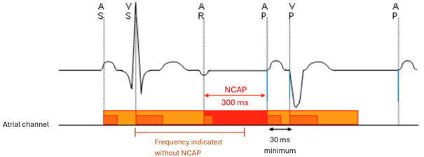 L'arythmie auriculaire peut être déclenchée si un événement auriculaire stimulé se produit pendant la période vulnérable de l'oreillette. La stimulation auriculaire non compétitive (NCAP) est conçue pour empêcher le déclenchement d'une arythmie auriculaire en stimulant pendant la période réfractaire relative de l'oreillette.