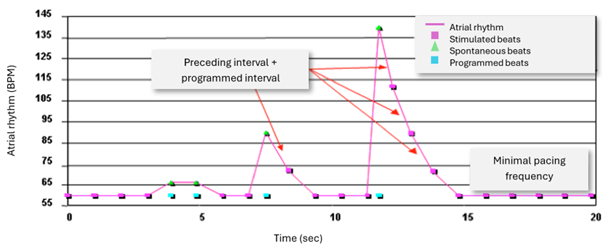 Lorsque le dispositif est activé par un PAC, il délivre une impulsion de stimulation à l'intervalle prématuré augmenté d'un pourcentage de cet intervalle (défini par le paramètre de pourcentage d'incrémentation de l'intervalle programmé). Pour chaque événement auriculaire détecté ou stimulé par la suite, le dispositif continue d'augmenter chaque intervalle de stimulation du pourcentage programmé de l'intervalle précédent. Le paramètre de fréquence maximale fixe une limite pour l'ARS. Les impulsions de stimulation auriculaire délivrées pour l'ARS sont annotées PP (Proactive Pacing) sur le marqueur d'événement.