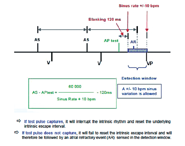 1) si le patient est en rythme sinusal normal et stable, l'appareil choisit la méthode de réinitialisation de la chambre atriale (ACR), ou 2) dans le cas contraire, il sélectionne la méthode de conduction AV (AVC). La méthode ACR, qui nécessite un rythme sinusal stable, évalue la capture en observant la réponse du rythme intrinsèque à l'impulsion auriculaire de test. Si cette dernière n'est pas capturée, le nœud sinusal n'est pas réinitialisé et un événement auriculaire qui suit l'impulsion test se produit pendant la période réfractaire auriculaire. En l'absence d'événement auriculaire détecté dans la période réfractaire pendant le délai AV, l'ACR détermine que la stimulation a capturé le myocarde.