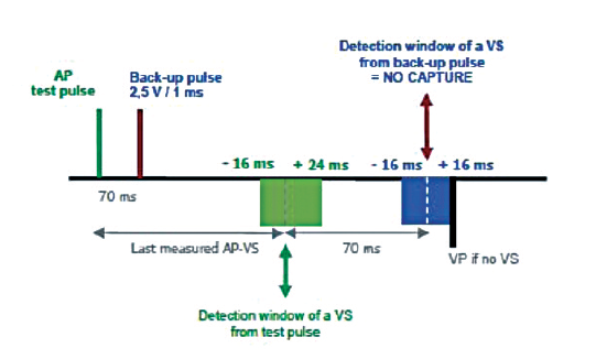 La méthode AVC est appliquée lorsqu'une conduction AV 1:1 stable est observée pendant la stimulation auriculaire. La fréquence de stimulation auriculaire augmente de 15 bpm (sans toutefois dépasser 101 bpm) et le délai AV est prolongé pour tenter d'obtenir un rythme AP-VS stable. L'AVC évalue la capture en observant la réponse ventriculaire conduite à l'impulsion auriculaire de test. Chaque stimulation auriculaire est suivie d'une impulsion de secours d'une amplitude programmée et d'une durée de 1,0 ms afin de maintenir un rythme stable pendant toute la durée du test. Lorsqu'un événement ventriculaire conduit est détecté à peu près à l'intervalle AP-VS prévu en réponse à l'impulsion auriculaire de test, l'AVC détermine que la stimulation a capturé le myocarde.