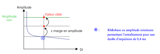 Cette adaptation ne peut se faire que dans une gamme de sorties définie par une limite inférieure programmable (paramètre Minimum Adapted Amplitude) et une limite de seuil supérieure de 5,0 V et 1,0 ms. La durée d'impulsion minimale pour la gestion du seuil ventriculaire est de 0,4 ms.