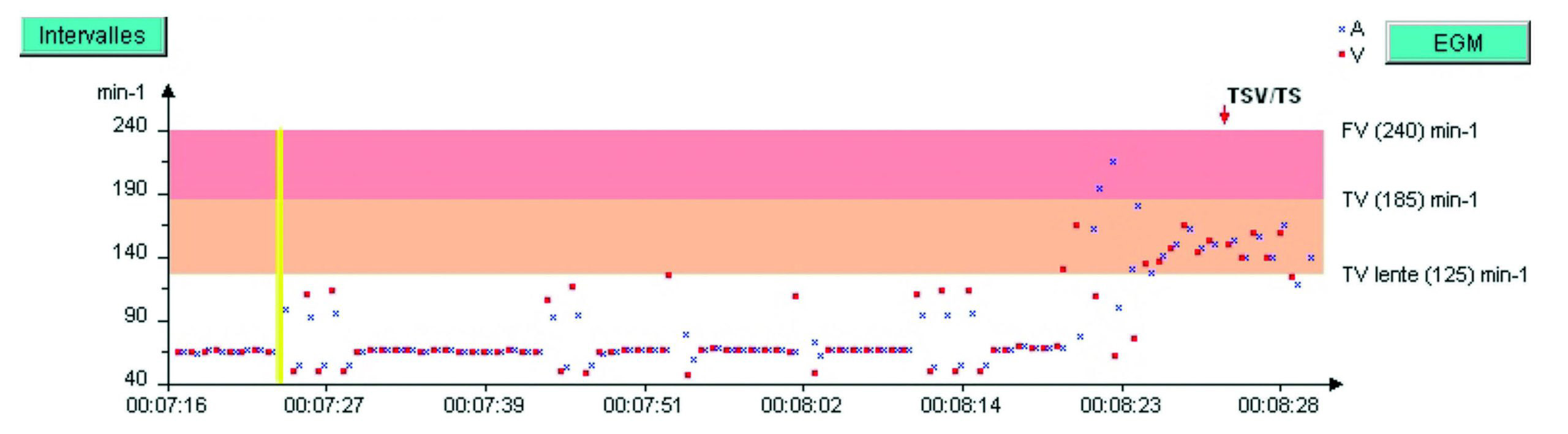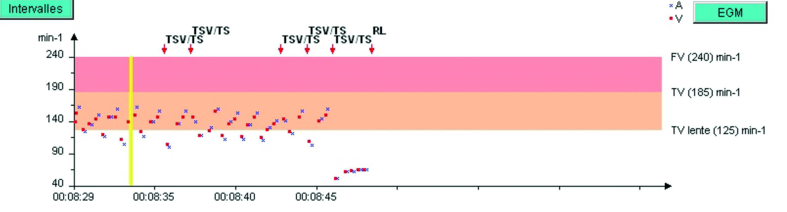 - Une zone lente commençant à 125/min, 30 cycles de persistance, avec SAT et séquences de chocs.