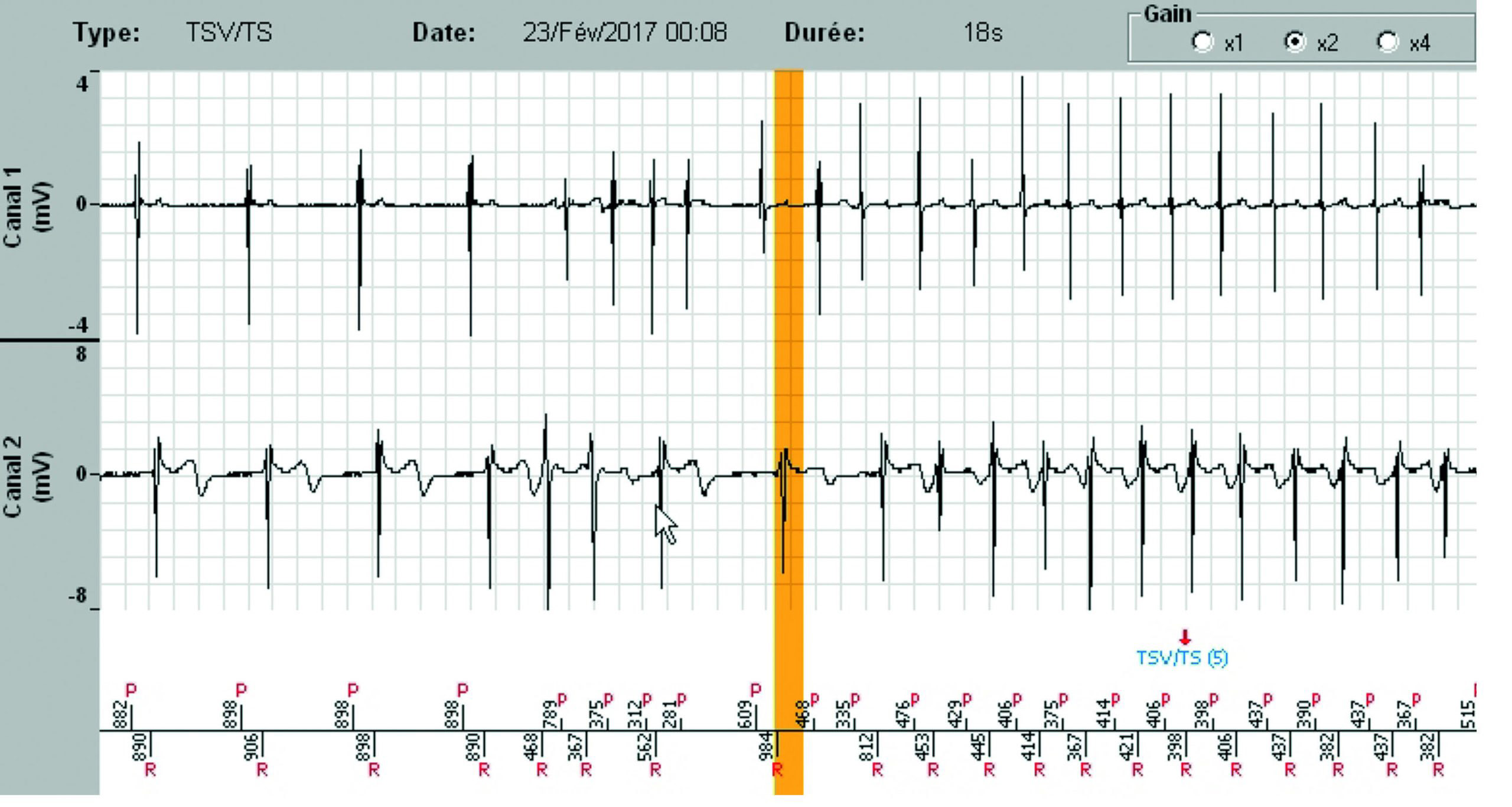 - La tachycardie est précédée d'un triplet ventriculaire avec une probable conduction rétrograde, suivie d'une déstabilisation immédiate du rythme auriculaire qui initie une tachycardie auriculaire instable et répercutée dans le ventricule, conduisant au diagnostic de TSV. Chaque variation de l'intervalle P'P’ induit la même variation de l'intervalle RR correspondant. La tachycardie est bien contrôlée par l'oreillette.