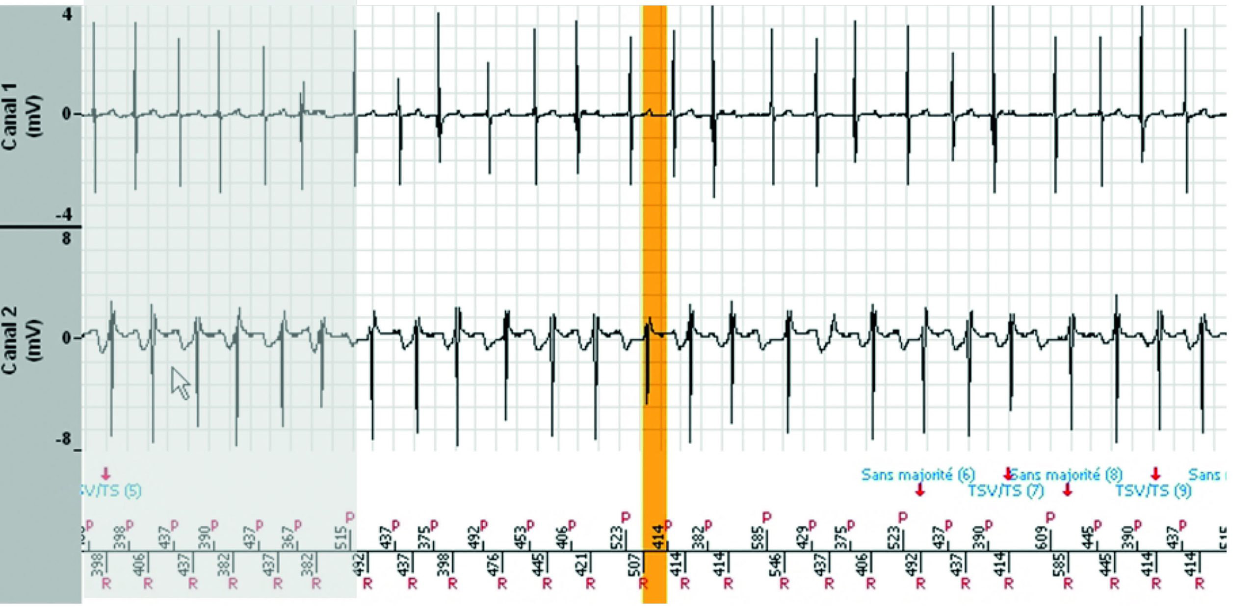 - Le diagnostic est non majoritaire lorsque le rythme entre ou revient dans la zone lente (non tachycardique) pendant au moins 3 cycles sur 8 (mais moins de 6), puis redevient instable avec un diagnostic de TSV jusqu'à la fin de l'épisode.