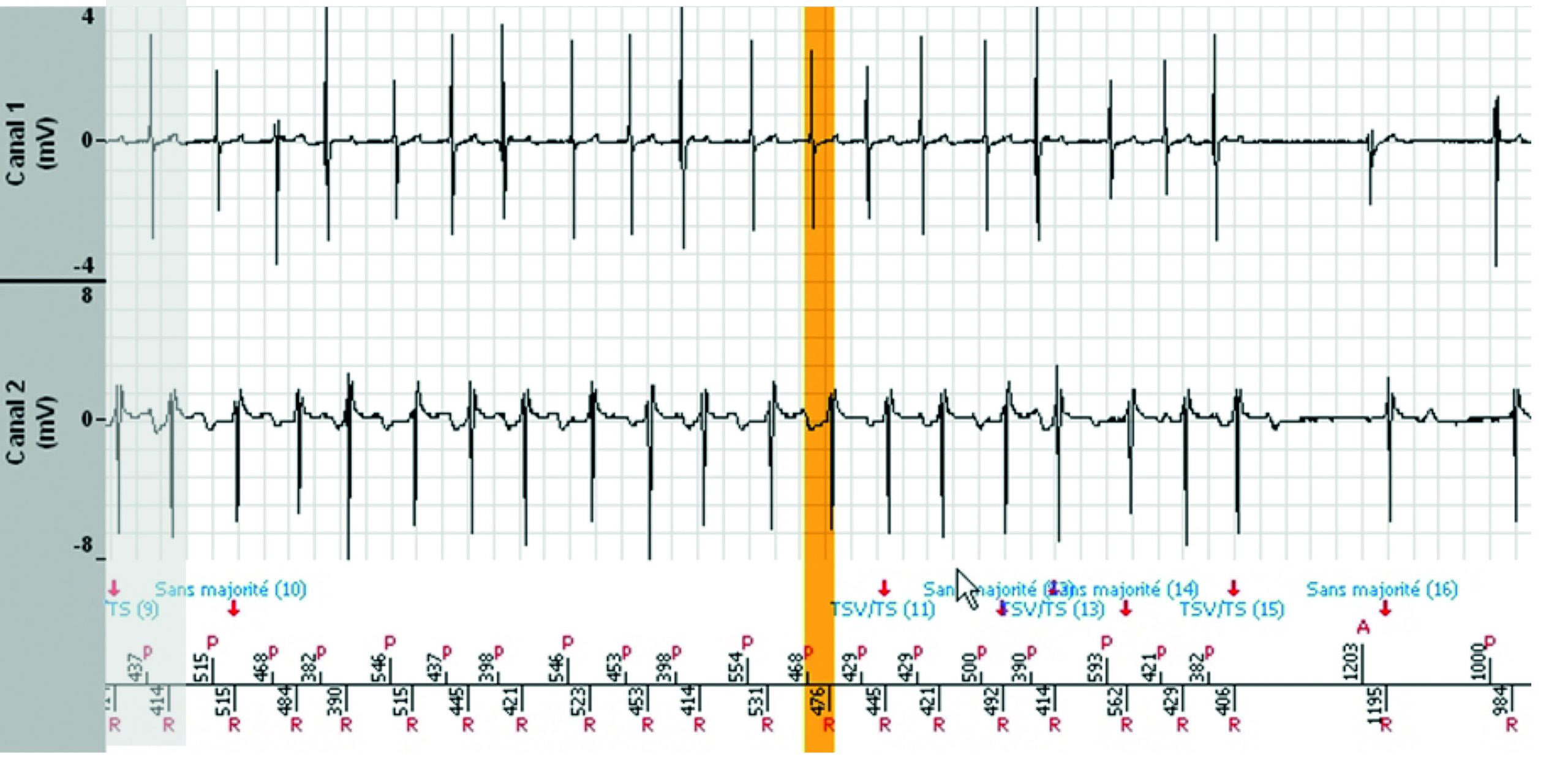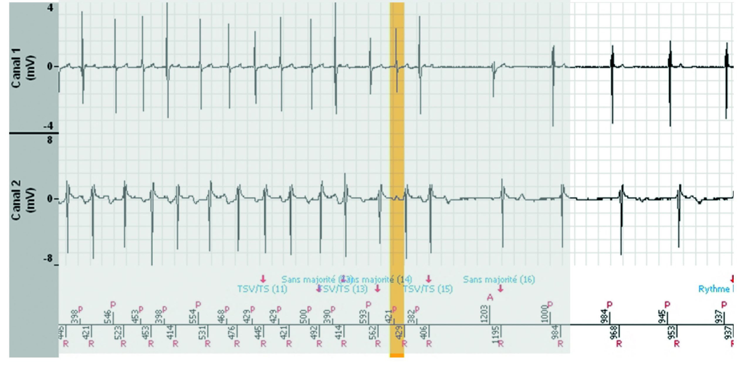 - Le tachogramme démontre des extrasystoles auriculaires et ventriculaires pendant un rythme sinusal conduit.