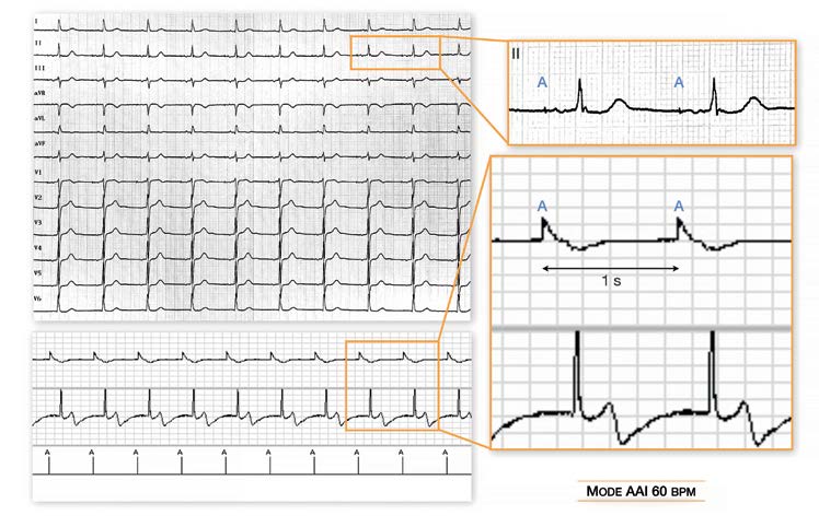 Mode AAI 60 battements/minute: stimulation atriale à la fréquence minimale (intervalle d’échappement de 1 seconde) plus rapide que l’activité sinusale spontanée; conduction atrio-ventriculaire spontanée; Tracé 8: Mode AAI 60 Battements/minute