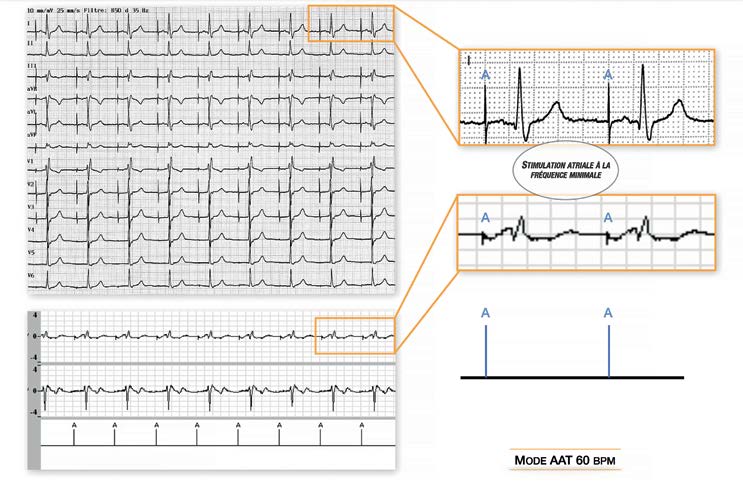 Mode AAT 60 battements/minute: stimulation atriale à la fréquence de base (A); la fréquence sinusale spontanée est inférieure à la fréquence de stimulation, l’oreillette est totalement capturée. Tracé 5: Mode AAT 60 Battements/minute