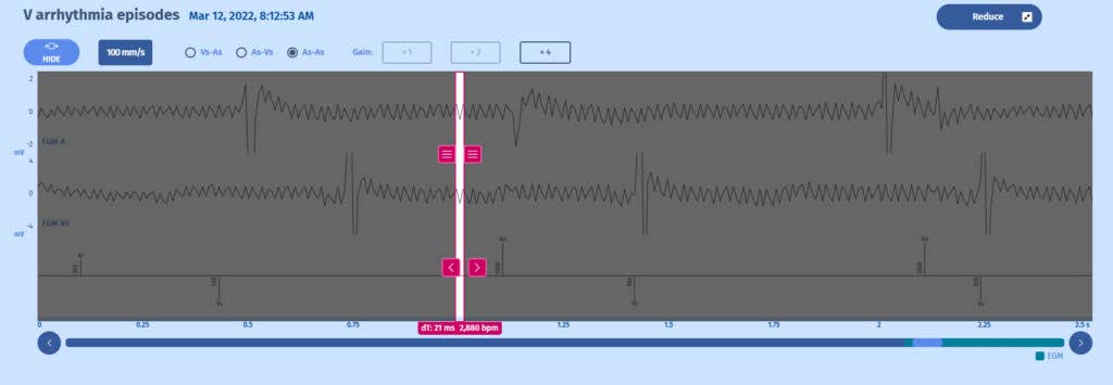 Au début, le rythme auriculaire et ventriculaire est lent, avec quelques événements rapides isolés. Soudain, on observe un rythme extrêmement rapide avec des cycles ventriculaires si élevés dans la zone de FV qu'ils sont proches de la période de suppression. Nous observons un phénomène d'allumage et d'extinction soudains. Ces aspects sont typiques d'une interférence provenant