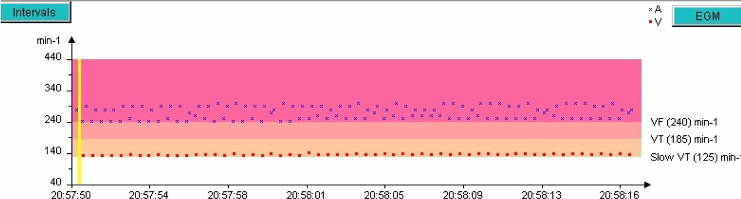 - Dans ce cas, nous pouvons déclarer que la tachycardie est supraventriculaire. Après une phase d'instabilité du rythme sinusal liée aux ESV, la tachycardie auriculaire débute avec une conduction AV variable à 20:57:30, ce qui fait entrer le défibrillateur