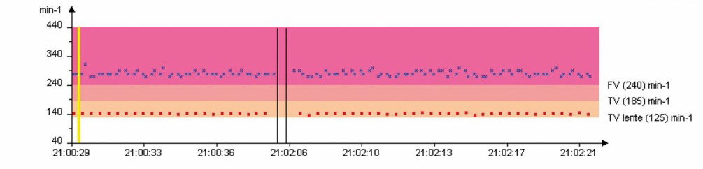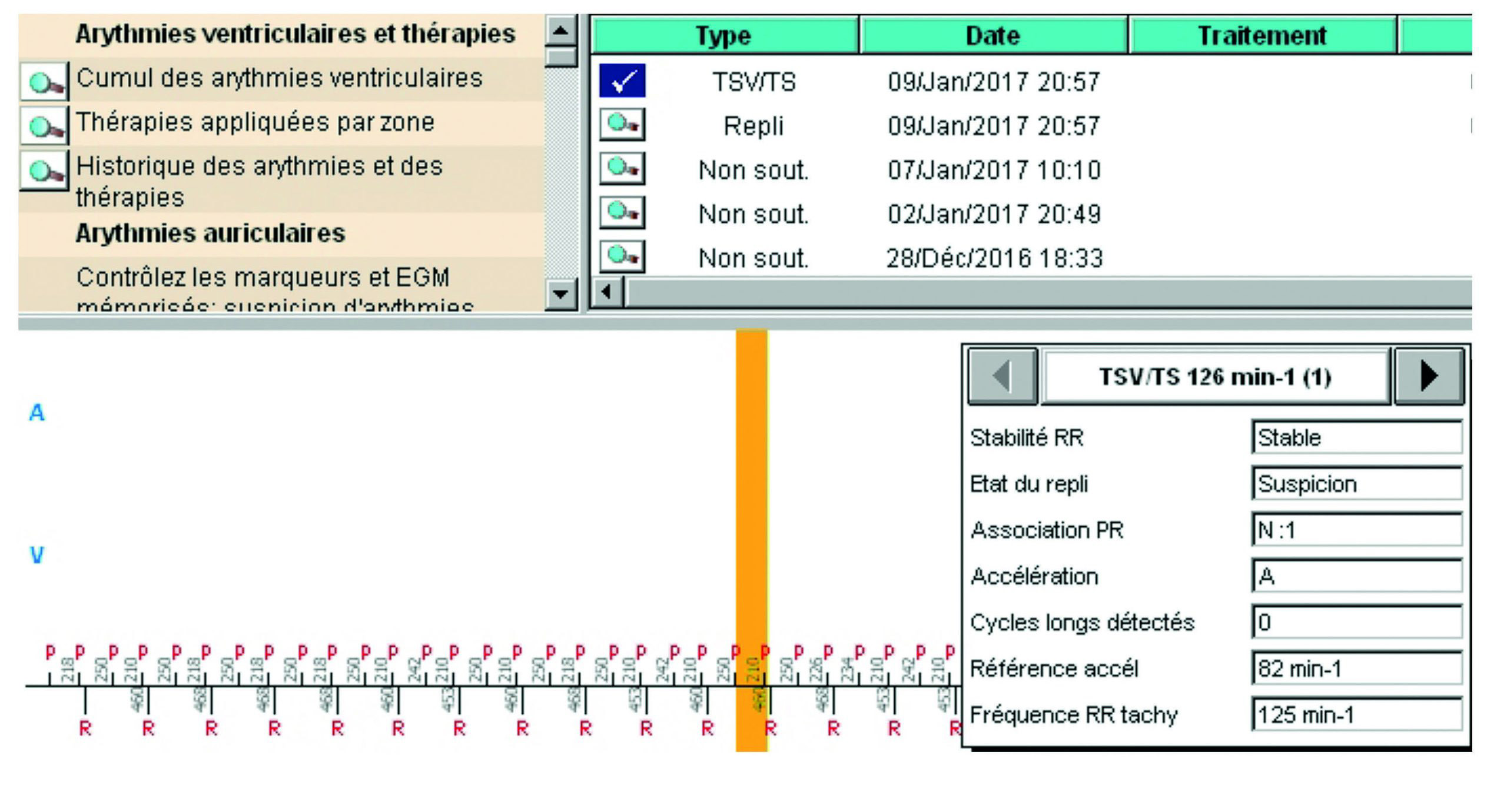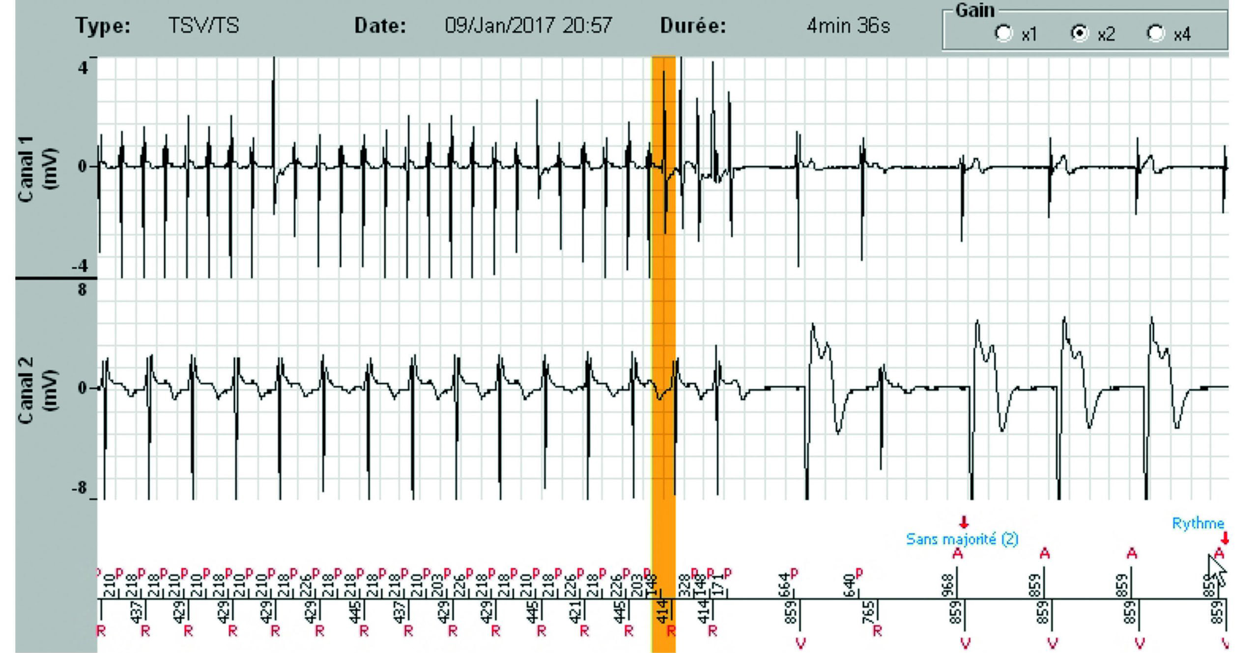 en suspicion sans changer de mode puis en réellement en mode switch. La fréquence ventriculaire devient stable environ 10 secondes après le début. La poursuite de l'épisode en commutation de mode constitue l'épisode appelé TSV.