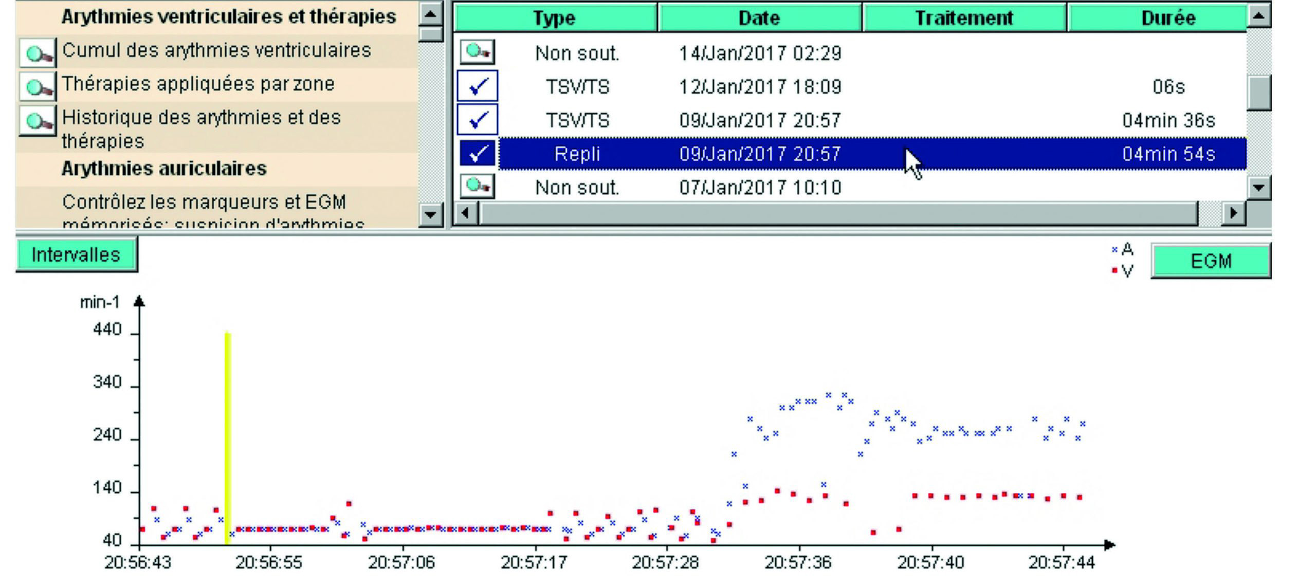 même moment. Le début de la tachycardie est donc analysable, mais à l'intérieur de l'épisode de commutation de mode. Ceci est toutefois moins pratique compte tenu des principes de fonctionnement des algorithmes de commutation de mode “Fallback” et PARAD+ ainsi que de la gestion des données stockées. En résumé, la commutation de mode “Fallback” identifiera une arythmie auriculaire après 28 cycles ventriculaires impliquant des ESA tandis que le PARAD+ reconnaîtra cette même arythmie après cycles ventriculaires (2 cycles initiaux non pris en compte, 6 pour la première majorité et 30 pour la persistance) avec les critères de TSV remplis. De plus, les EGM et les marqueurs ne sont pas “ duplicables “, c'est-à-dire qu'une fois que les EGM/marqueurs correspondant au critère de repli sont mémorisés/stockés, ils ne sont plus utilisables pour l'épisode suivant (en l'occurrence, la TSV identifiée par PARAD+).