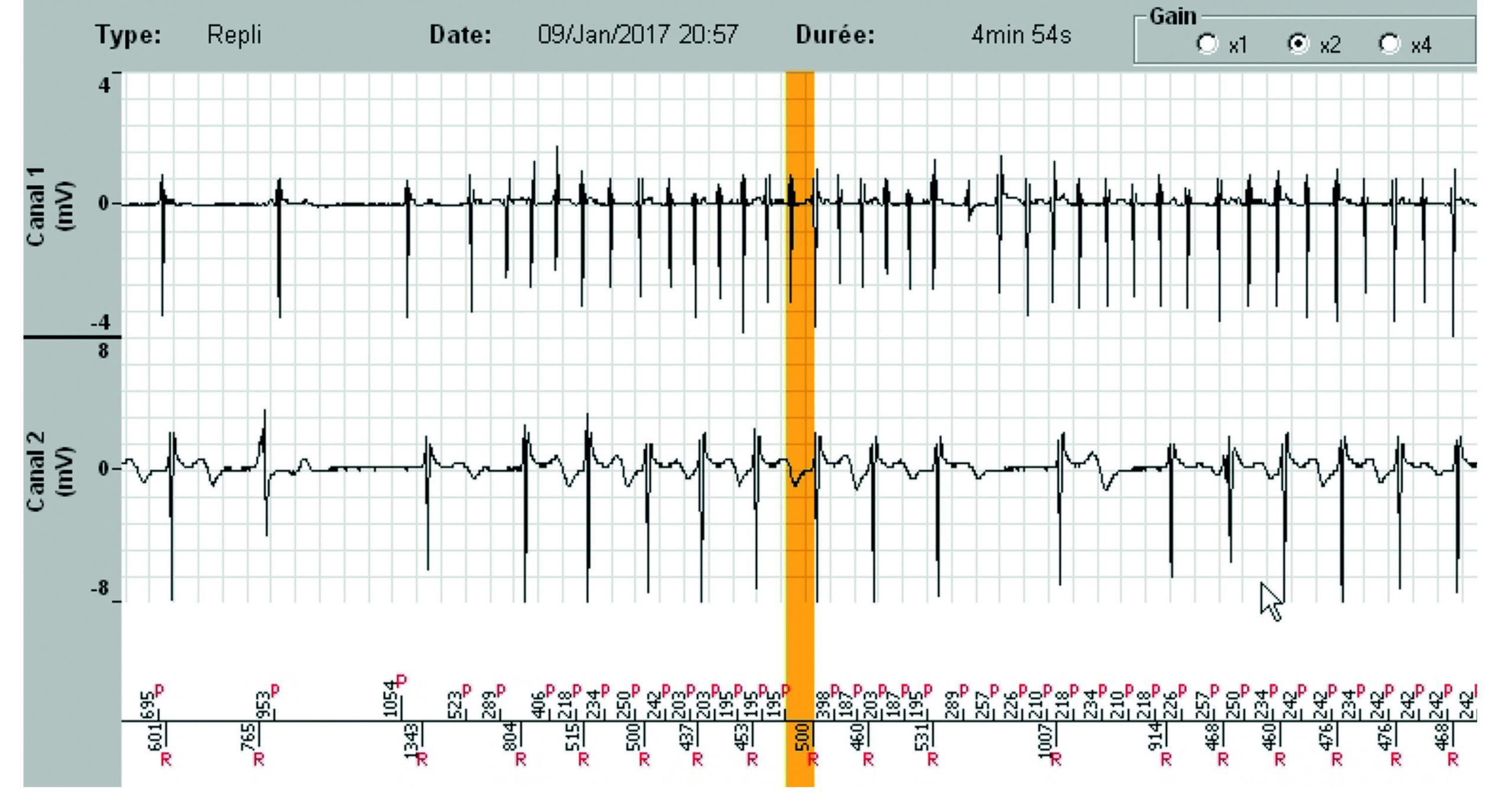 - Le défibrillateur documente un épisode de TSV dans la liste des épisodes enregistrés, dont la durée était de 4 minutes 36 secondes. L'heure de début du tachogramme est 20:57:50. Le début de la tachycardie n'est pas visible. La fin de la tachycardie peut être analysée avec un retour lent qui marque la fin de l'épisode.