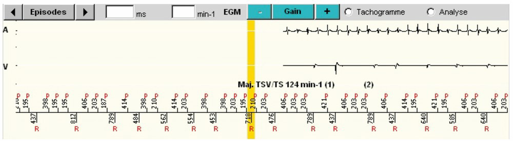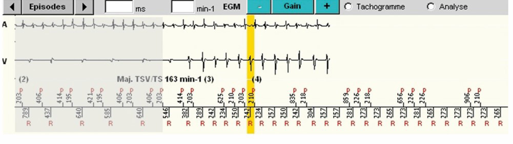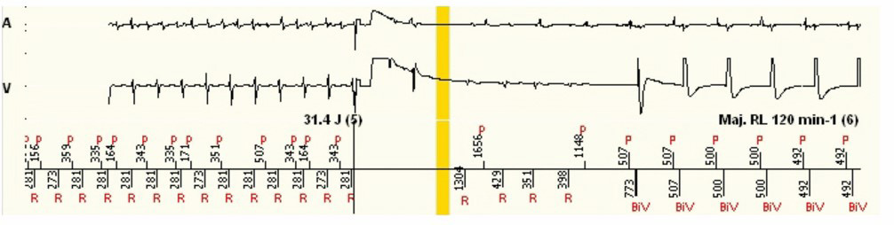 Un homme de 72 ans équipé d'un défibrillateur triple chambre pour une cardiopathie dilatée à coronaires saines, une fraction d'éjection de 28%, un bloc de branche gauche complet et un traitement médical maximal. Le patient n'a jamais présenté de TV jusqu'à