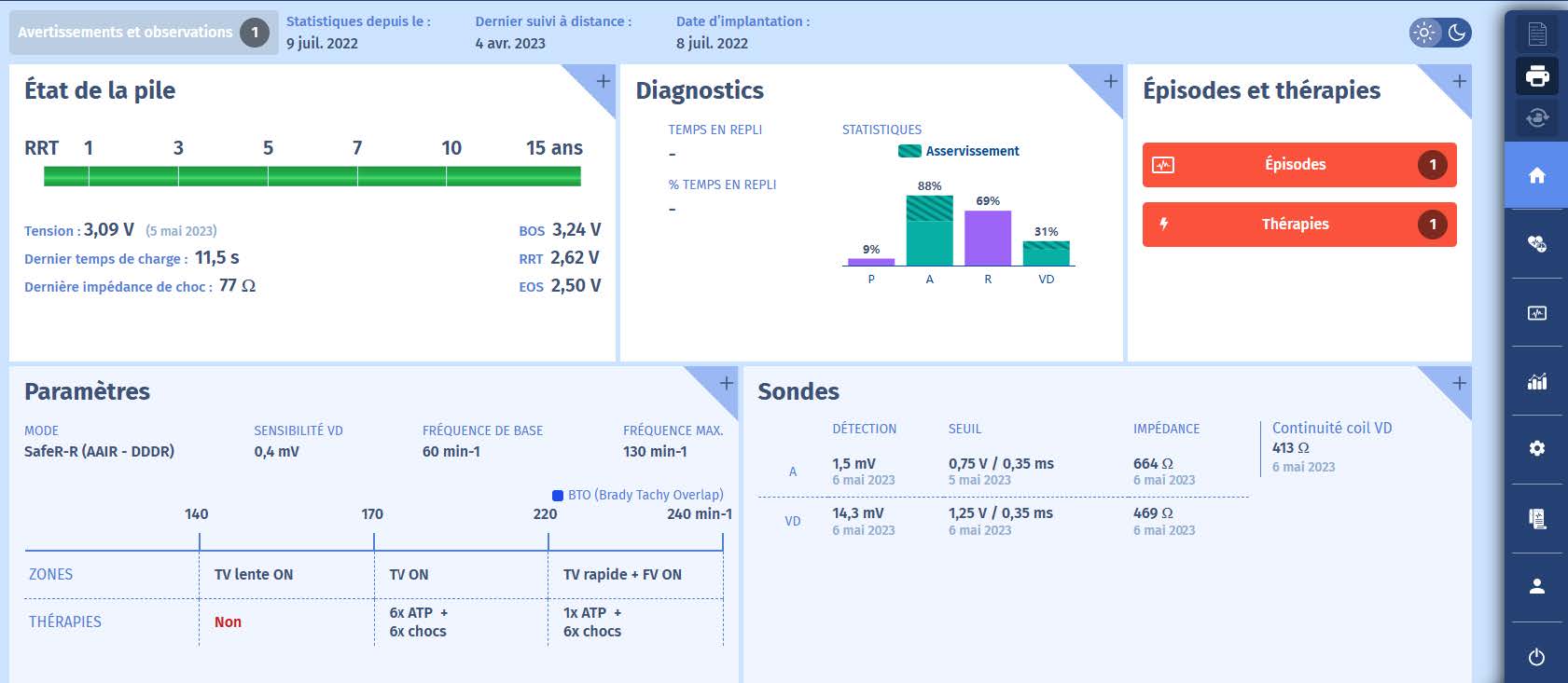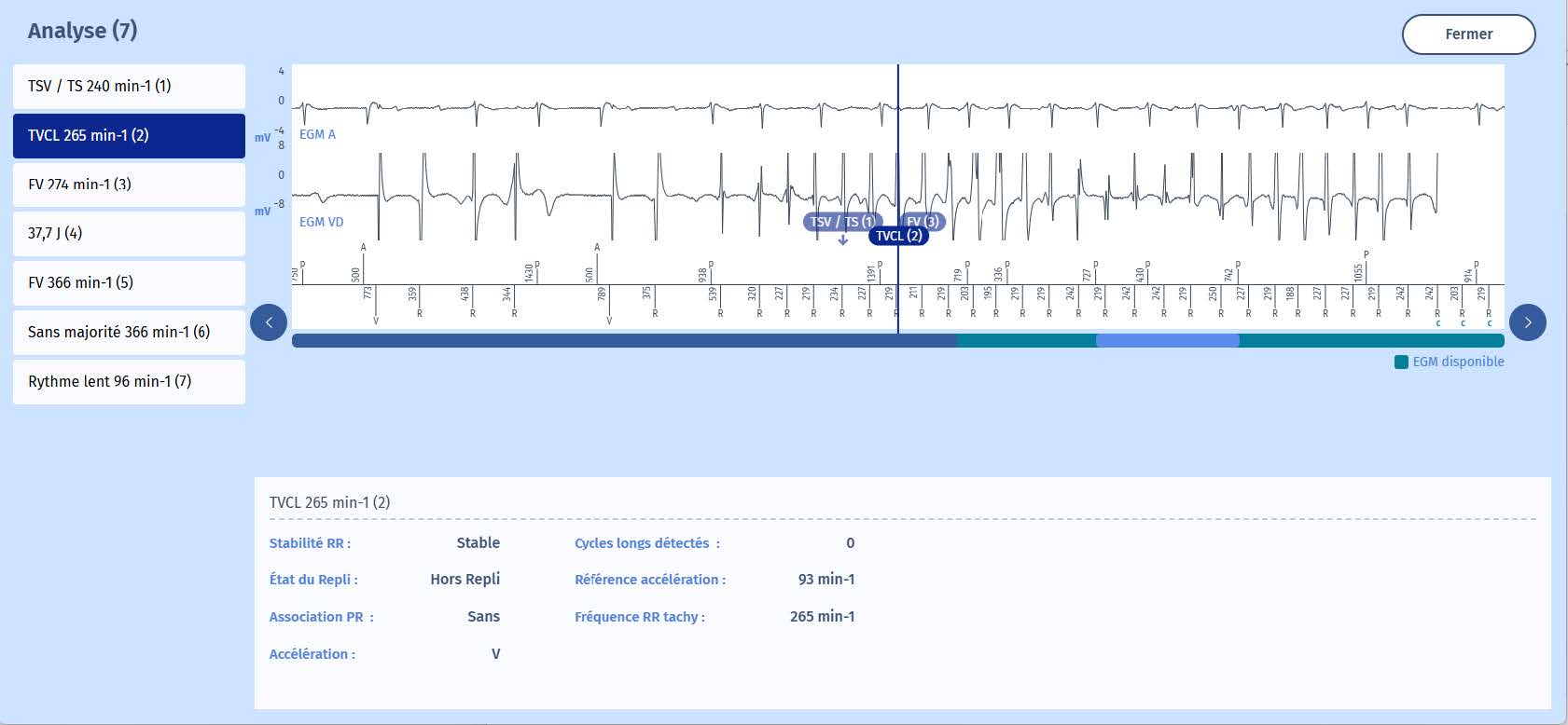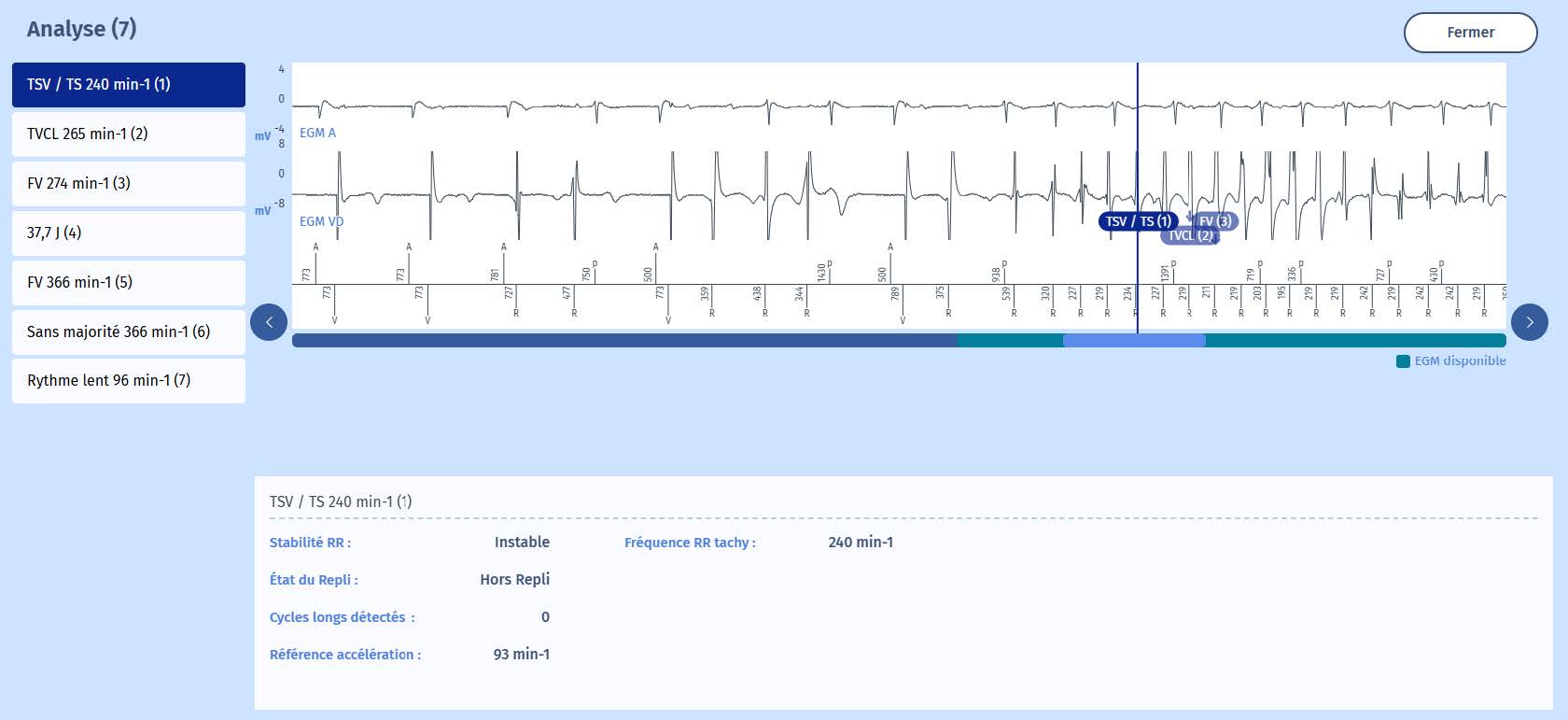 Un patient de 70 ans est implanté d'un DAI double sonde (ULYS DF4) dans le cadre de la prévention secondaire (FV) d'une cardiomyopathie ischémique. Vous interrogez l'appareil au service des urgences après qu'il ait ressenti un choc.