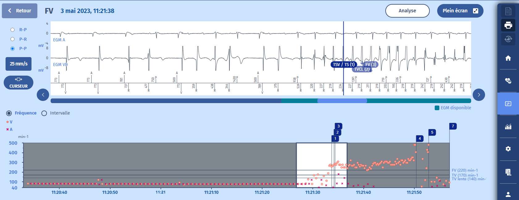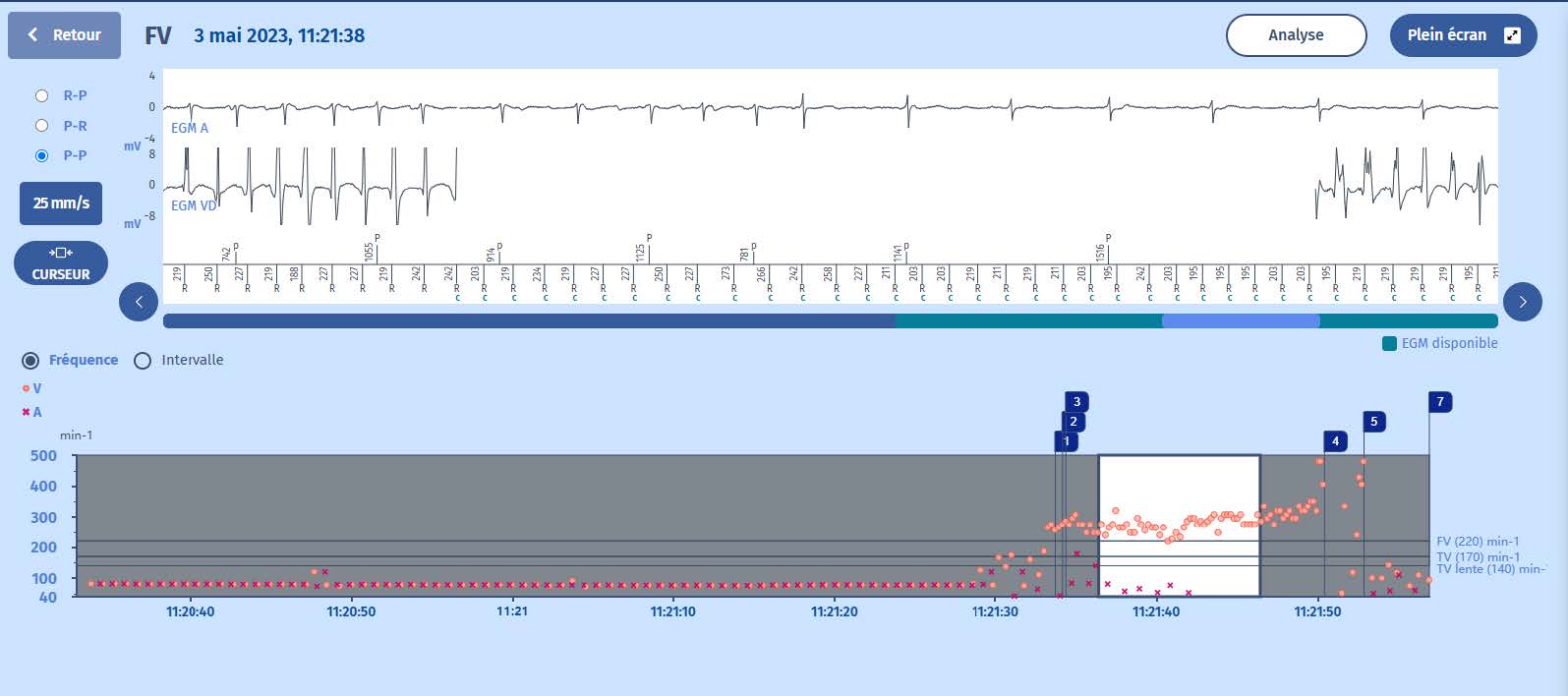 Le tracé des intervalles montre un rythme auriculaire et ventriculaire stables avec une accélération soudaine des événements ventriculaires, commençant par des extrasystoles et se poursuivant par une tachycardie plus organisée dans la zone de FV. Après le choc (marqueur 4), il y a à nouveau quelques extrasystoles avant le retour au rythme lent.)