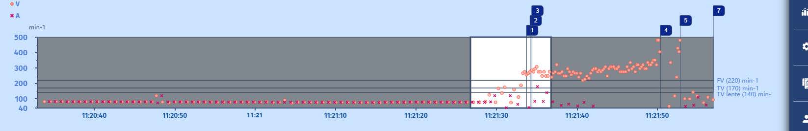Lorsque l'arythmie s'accélère dans la zone FV, le marqueur FV apparaît rapidement et la persistance FV commence (à une valeur de 1) tandis que la persistance TV passe à 2 (elle était de 1 au cours du cycle précédent en même temps que le marqueur VTLC). Il n'y a pas de discrimination dans la zone VF des DAI MicroPort, de sorte que tout événement 6/8 dans la zone VF entraînera un marqueur VF. Il existe cependant une autre vérification de la stabilité qui est nécessaire pour faire le choix entre les thérapies Fast-VT ou FV, mais nous y reviendrons plus tard. Après le remplissage de la persistance de la FV (20 cycles), la charge commence.
