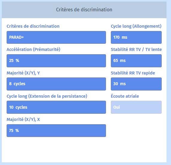 Sous les paramètres "Tachy", nous pouvons trouver et modifier la Majorité X sur Y. Par défaut, la Majorité est fixée à 75% (X) sur 8 cycles (Y). Par défaut, la majorité est fixée à 75% (X) sur 8 cycles (Y) et ces paramètres ne doivent pas être modifiés.