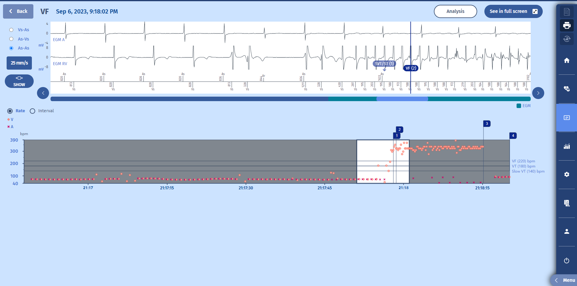 - Chaque cycle ventriculaire détecté en dehors des périodes réfractaires est classé comme : Lent, TV ou FV, en fonction de la programmation des zones de tachycardie.