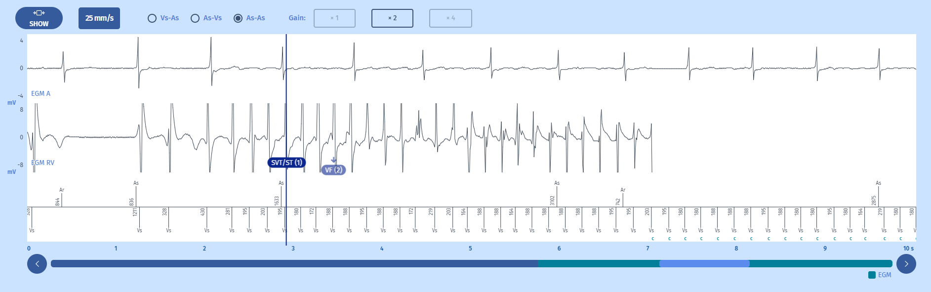 Tracés : Le tracé en haut intitulé EGM A est l'électrogramme auriculaire, le tracé en dessous intitulé EGM RV est l'électrogramme ventriculaire, enfin, en bas, les marqueurs auriculaires au-dessus de la ligne et les marqueurs ventriculaires en dessous, ainsi que les intervalles de temps. Le gain peut être modifié en haut (actuellement réglé sur X 2). La vitesse de défilement peut également être modifiée, allant de 12,5 à 100 mm/sec.