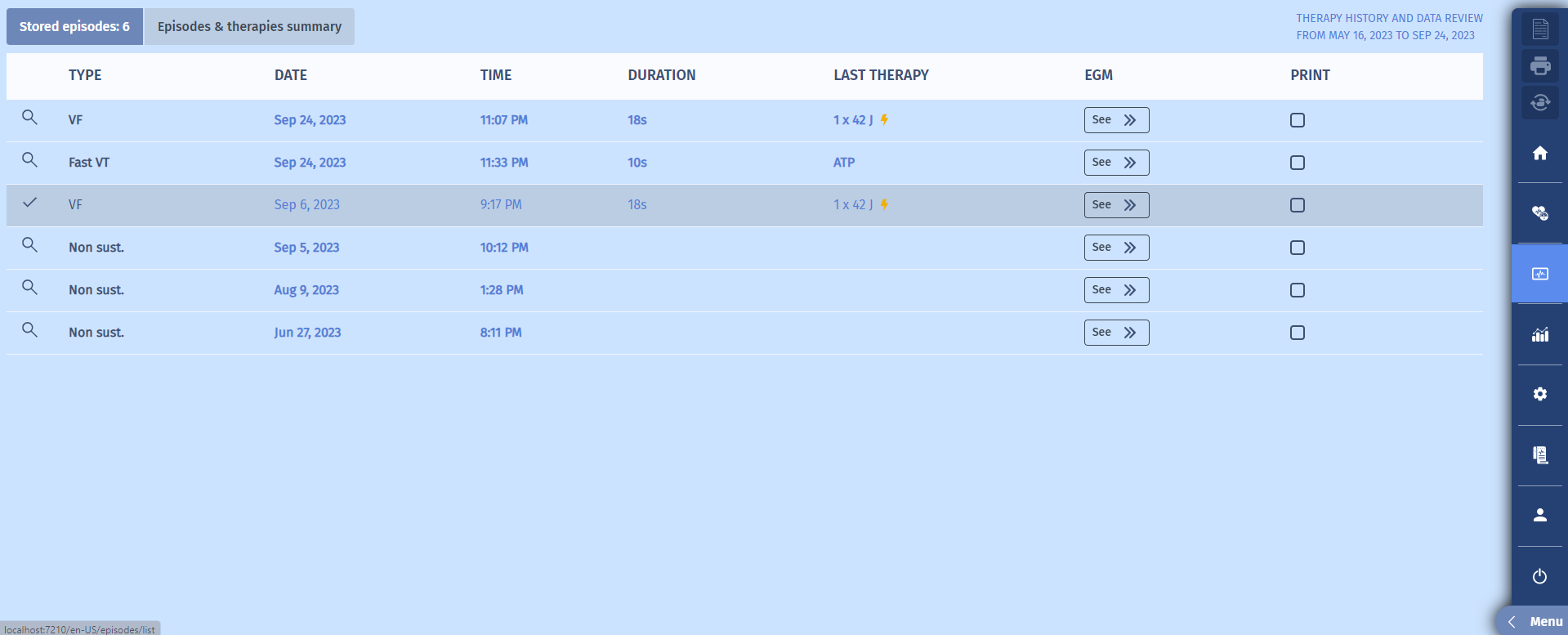 En cliquant sur l'un de ces boutons rouges (ou en accédant à l'écran “épisodes”), nous accédons à la liste d'épisodes suivante. La liste des épisodes mémorisés apparaît avec leur type, leur date, leur durée et le traitement appliqué.