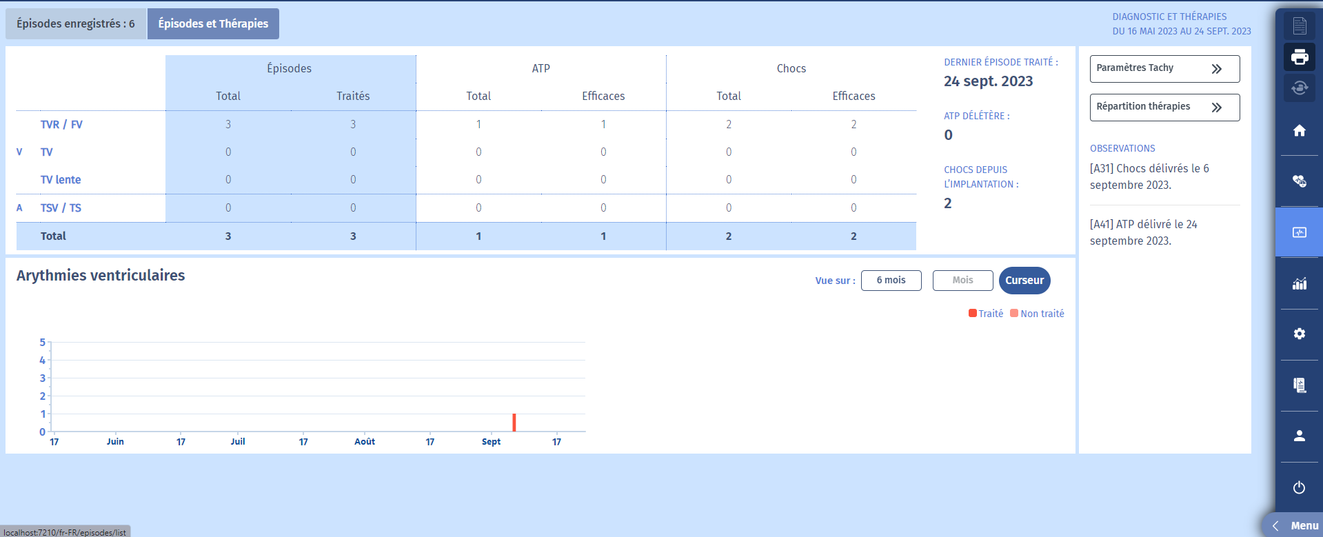 Lorsque nous cliquons sur “Résumé des épisodes et des thérapies”, nous pouvons observer un tableau avec les épisodes et les traitements. Nous pouvons voir qu'il y a eu 1 épisode de FV avec traitement.