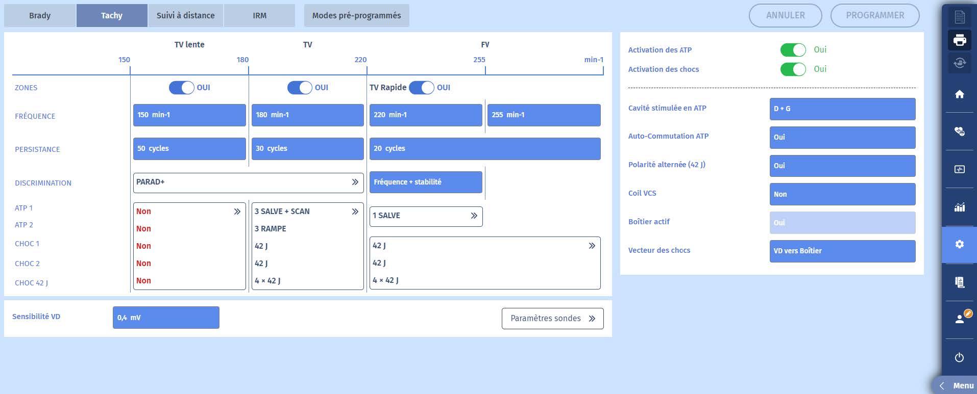 mis à zéro si une majorité de cycles lents est détectée ou une majorité de rythmes TSV/TS. De plus, il n'y a pas de distinction entre TV et TV lente lors du comptage de la persistance TV : ce n'est qu'à la fin de la persistance TV (la plus courte) que ledispositif calcule le taux moyen des 4 derniers cycles pour déterminer si le rythme estdans la zone TV ou dans la zone TV lente. Dans le présent exemple, tous les cycles setrouvent dans la zone de TV. Si les cycles entrent en FV, le diagnostic de FV est posé si