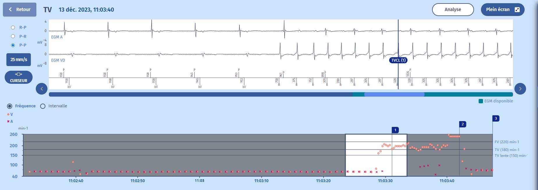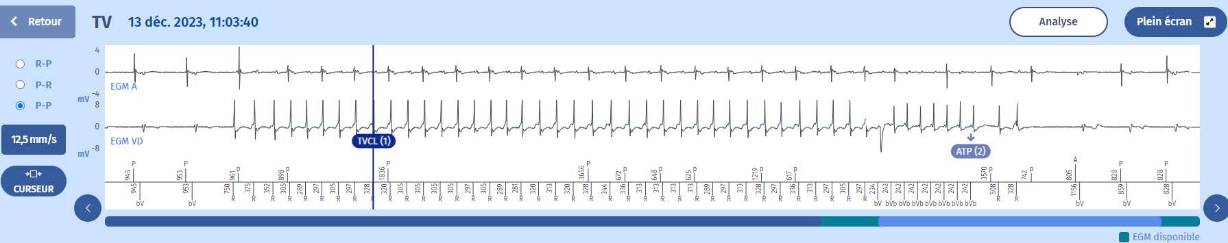 rythme ventriculaire est stable et il y a une dissociation atrio-ventriculaire (plus de signaux ventriculaires qu'auriculaires). Le marqueur est : 1 (TVLC). La phase de