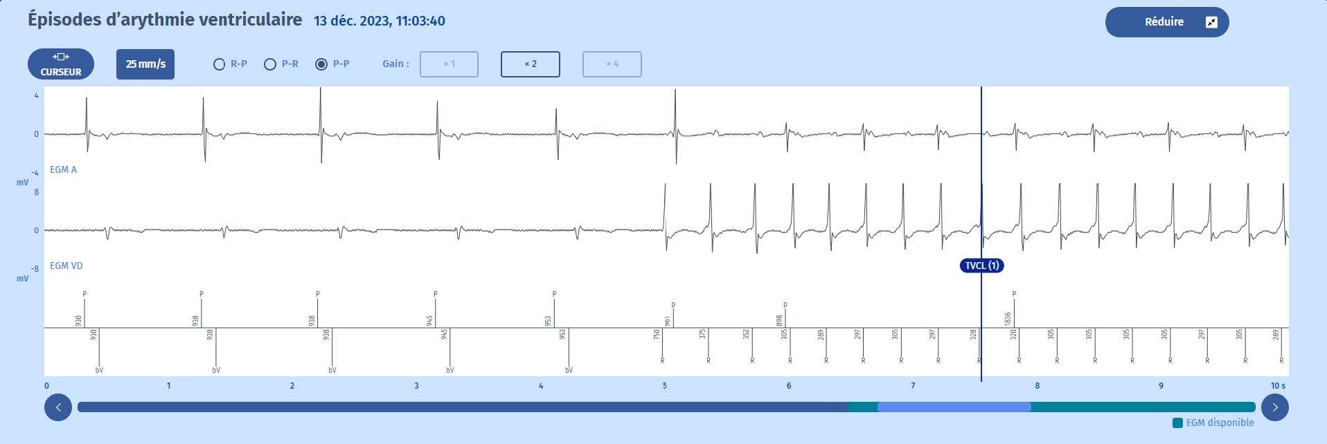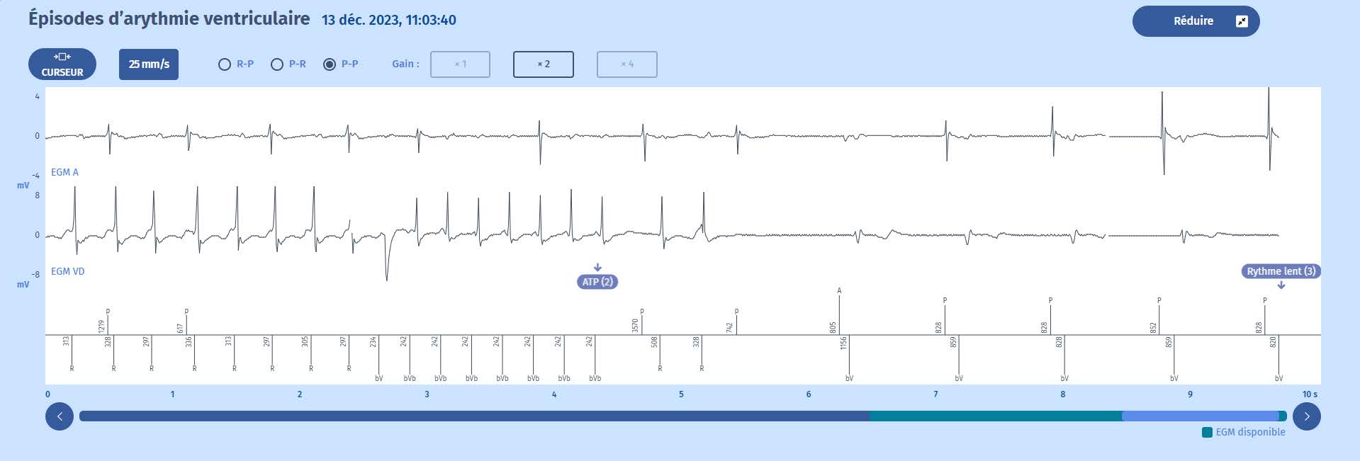 Tracés : Le tracé en haut est l'électrogramme auriculaire, en dessous, l'électrogramme ventriculaire, et enfin, en bas, les marqueurs auriculaires au-dessus de la ligne et les marqueurs