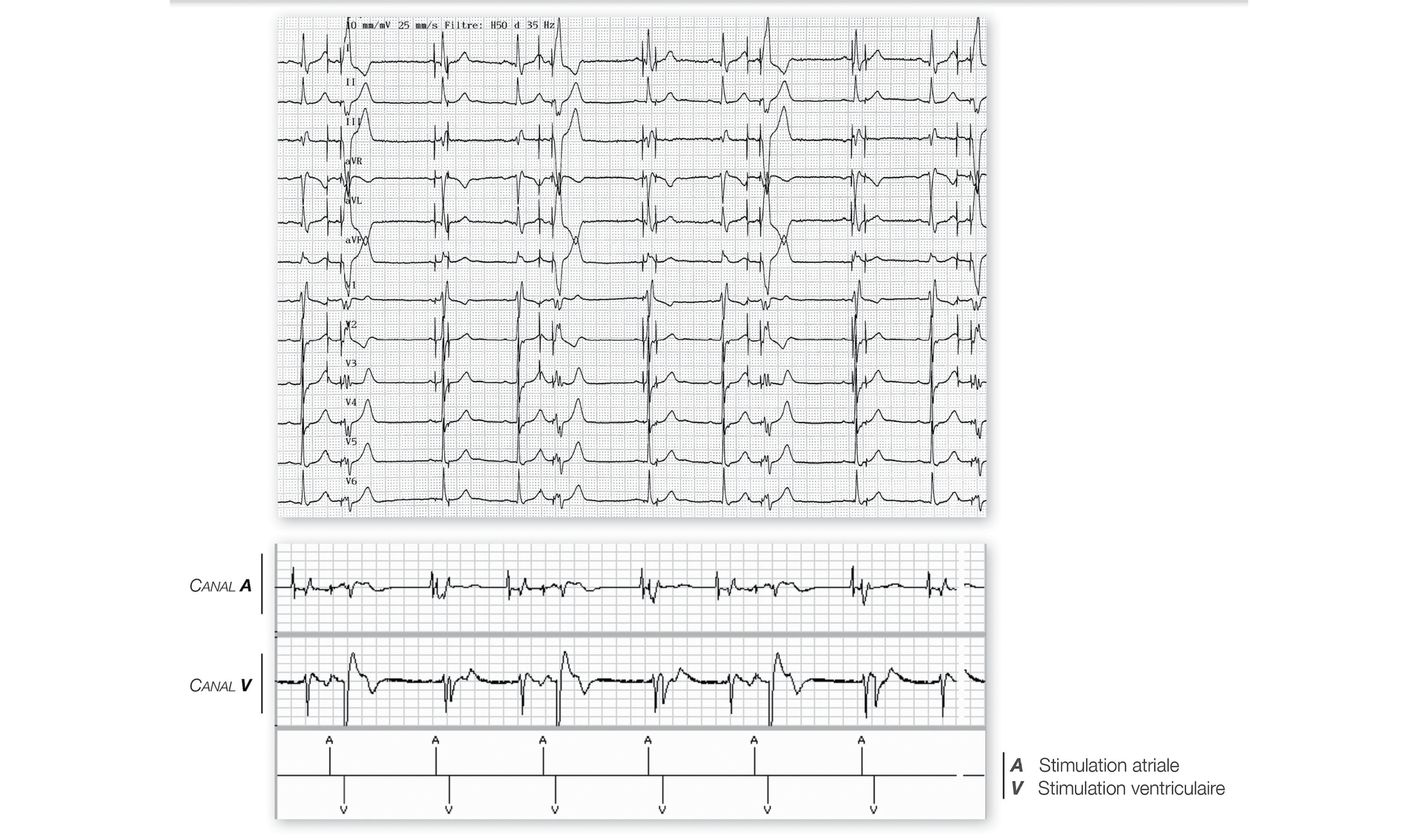 Homme de 69 ans, implanté d’un stimulateur double chambre Reply DR de la marque MicroPort™ pour dysfonction sinusale; les 2 sondes sont bien positionnées avec impédances de stimulation normales, détections correctes et seuils de stimulation satisfaisants; le lendemain de l’implantation, contrôle du stimulateur; programmation de différents modes de stimulation et enregistrement des tracés;