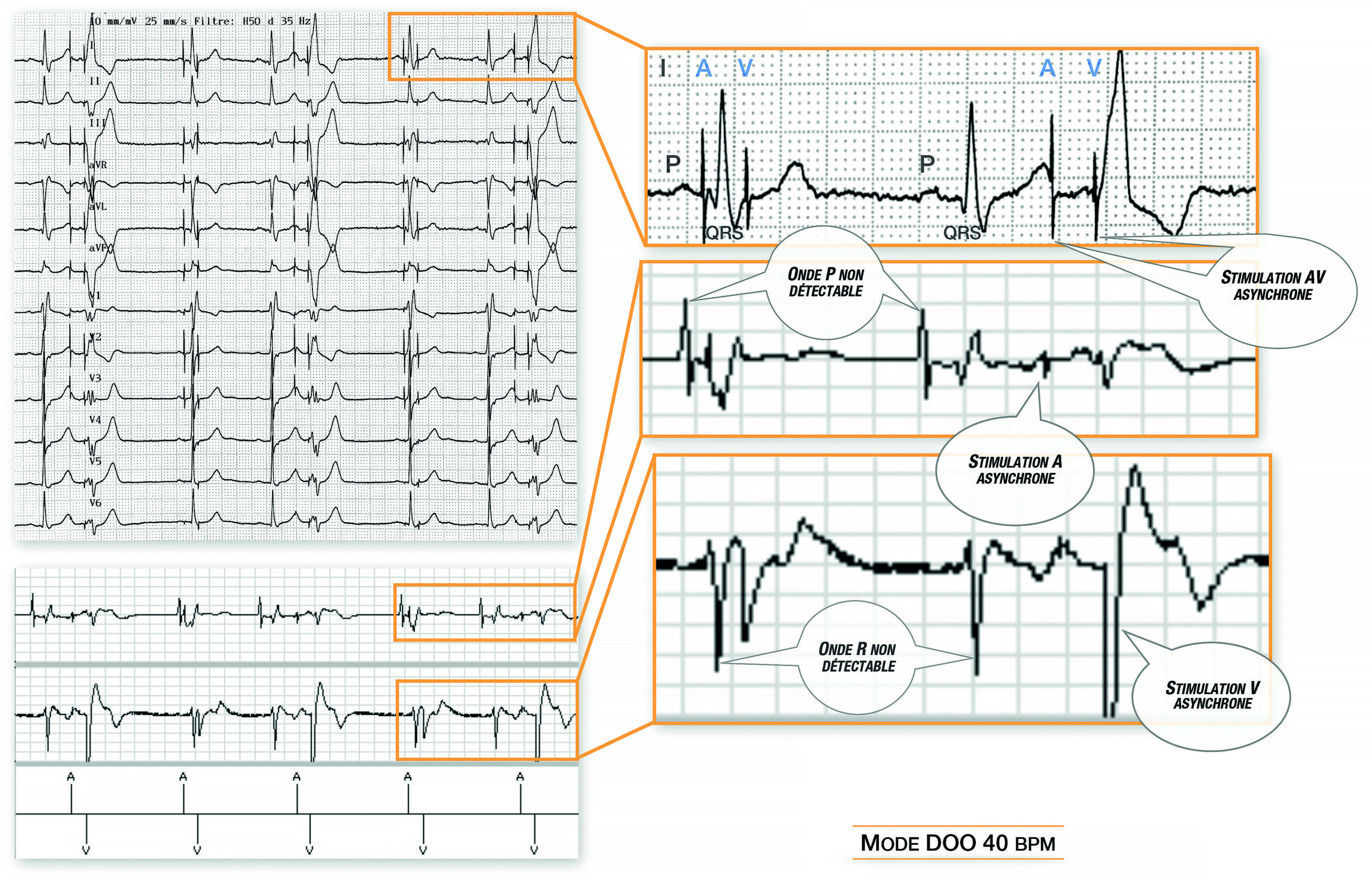 Le fonctionnement du mode D00 est inverse du mode 0D0: stimulation à intervalles fixes et absence de détection. Les modes asynchrones à fréquence fixe étaient les seuls modes disponibles sur les premiers stimulateurs cardiaques. Le mode D00 induit une stimulation atrio-ventriculaire séquentielle asynchrone, sans inhibition par les évènements intrinsèques. Quand le patient n’est pas dépendant, une parasystolie survient avec compétition entre activités spontanées et activités stimulées d’autant plus que la fréquence minimale programmée est basse. Ce mode permet de vérifier l’efficacité de la stimulation et permet d’éviter l’inhibition en cas d’exposition à une interférence extérieure (bistouri électrique chez un patient dépendant par exemple). La stimulation est efficace et capture l’oreillette ou le ventricule uniquement quand elle survient en dehors de la période réfractaire absolue physiologique qui suit une oreillette ou un ventricule spontané. Quand une stimulation ventriculaire survient durant la période vulnérable, il existe un risque d’induction d’un trouble du rythme ventriculaire. Le risque de fibrillation ventriculaire est limité mais augmente en présence d’une ischémie myocardique ou d’un trouble métabolique. De la même façon, une stimulation atriale asynchrone en période vulnérable atriale peut également induire un accès de fibrillation auriculaire. Les modes asynchrones sont aujourd’hui obsolètes et ne sont utilisés que dans 2 circonstances spécifiques: