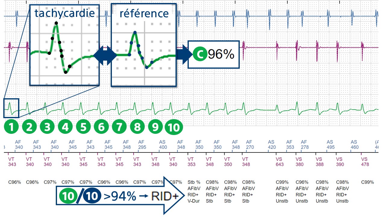 fin de la durée ; la discrimination est en faveur d'une TSV (RID+) ; en effet, pour au moins 3 battements/10 (fenêtre roulante), le vecteur est corrélé au vecteur de référence (les 10 derniers complexes ventriculaires avant la fin de la durée sont corrélés)