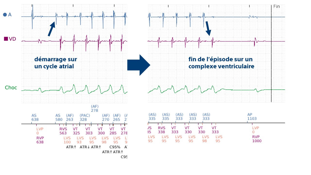 après 8 cycles VT ou VF consécutifs, marqueur V-Epsd ; les complexes ventriculaires sont corrélés
