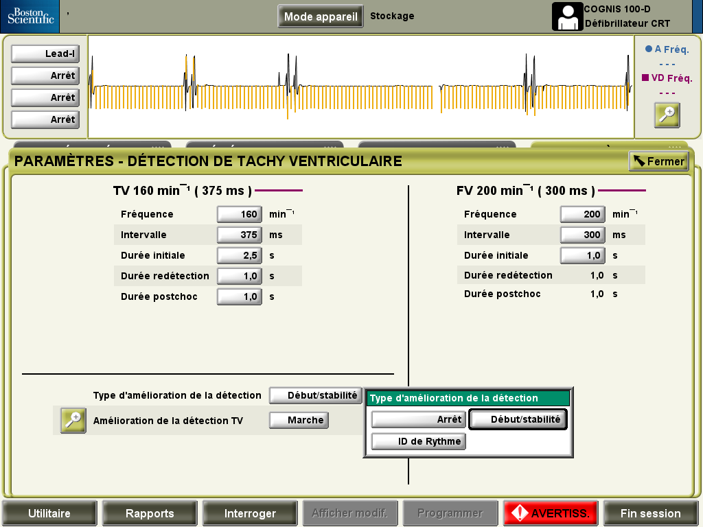 - arrêt : pas de discrimination (uniquement analyse de la fréquence et de la durée de l'arythmie)