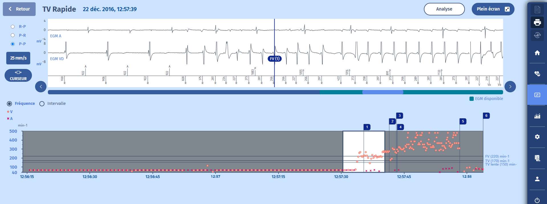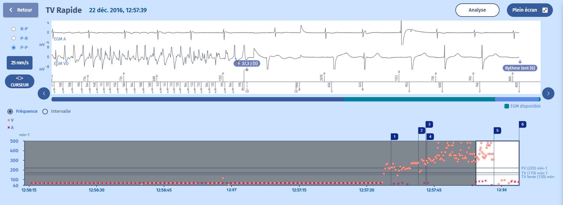 1 La tachycardie est immédiatement détectée dans la zone de FV après 8 cycles de tachycardie. On peut voir que la tachycardie n'est pas stable au départ.