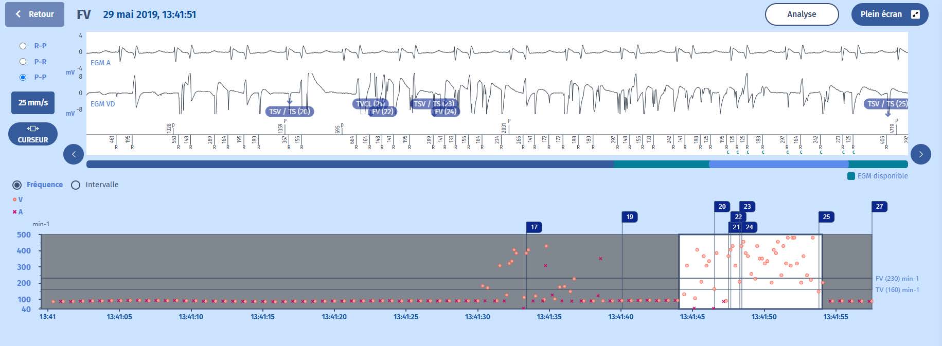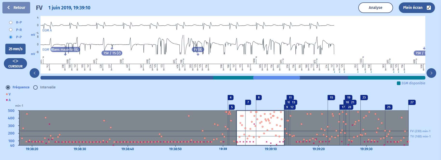 Un patient de 68 ans porteur d'une cardiomyopathie ischémique a été implanté avec un DAI double chambre (Platinium DR). Il se présente pour un contrôle de routine. Il affirme ne présenter