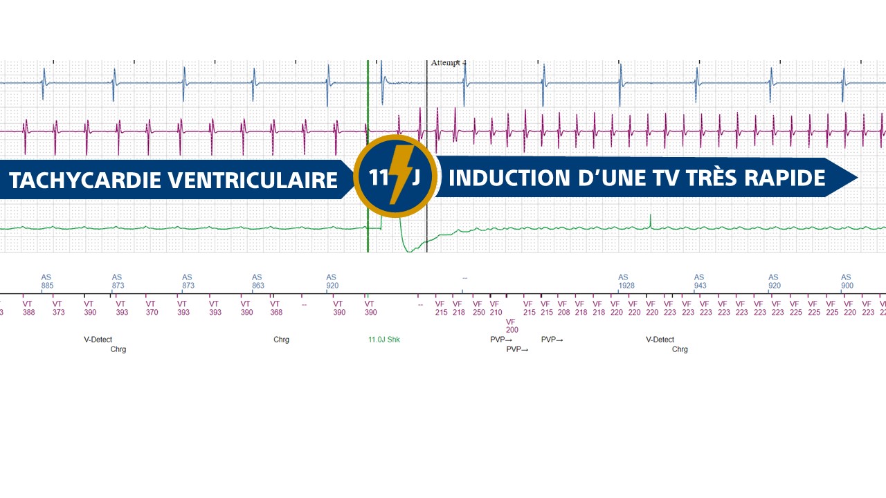 ce tracé montre la limite principale de la programmation d'un choc de faible amplitude (11 Joules) en zone de TV : risque pro-arythmogène et accélération de l'arythmie (concept de limite supérieure de vulnérabilité) ; le choc électrique a ainsi chez ce patient un effet inverse à celui recherché ; en-dessous d'une certaine valeur variable en fonction des patients et directement reliée au «seuil» de défibrillation, non seulement un choc peut s'avérer inefficace pour réduire une arythmie mais peut de surcroit accélérer et désorganiser une TV monomorphe en une arythmie polymorphe compromettant le pronostic du patient à court terme, laquelle necessite une nouvelle défibrillation à energie maximale.